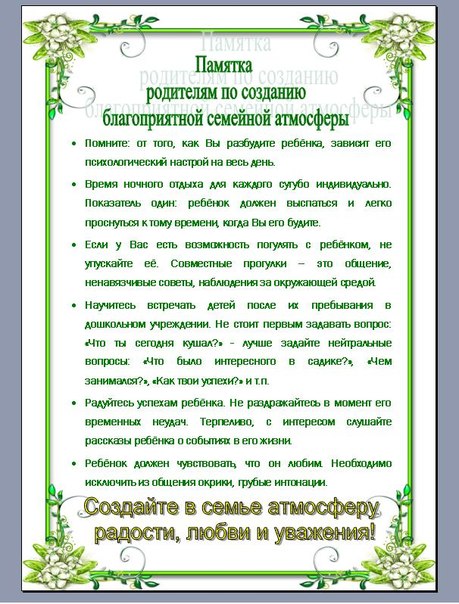 Памятка родителям по созданию благоприятной семейной атмосферы