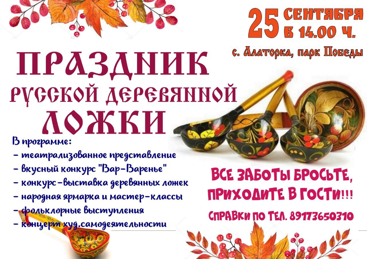 «Русская деревянная ложка»! 20.09.2021 9 Уважаемые жители и гости сельского поселения!!! Приглашаем Вас в парк «Победы» с. Алаторка на праздник «Русской деревянной ложки» — 25 сентября 2021 г., начало в 14.00 часов.