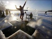 - Не нужно сидеть в проруби до мурашек. Озноб — это признак замерзания, значит уже пора выходить из воды. В среднем достаточно пребывать в воде 10 секунд — как раз можно трижды окунуться, как положено по традиции.