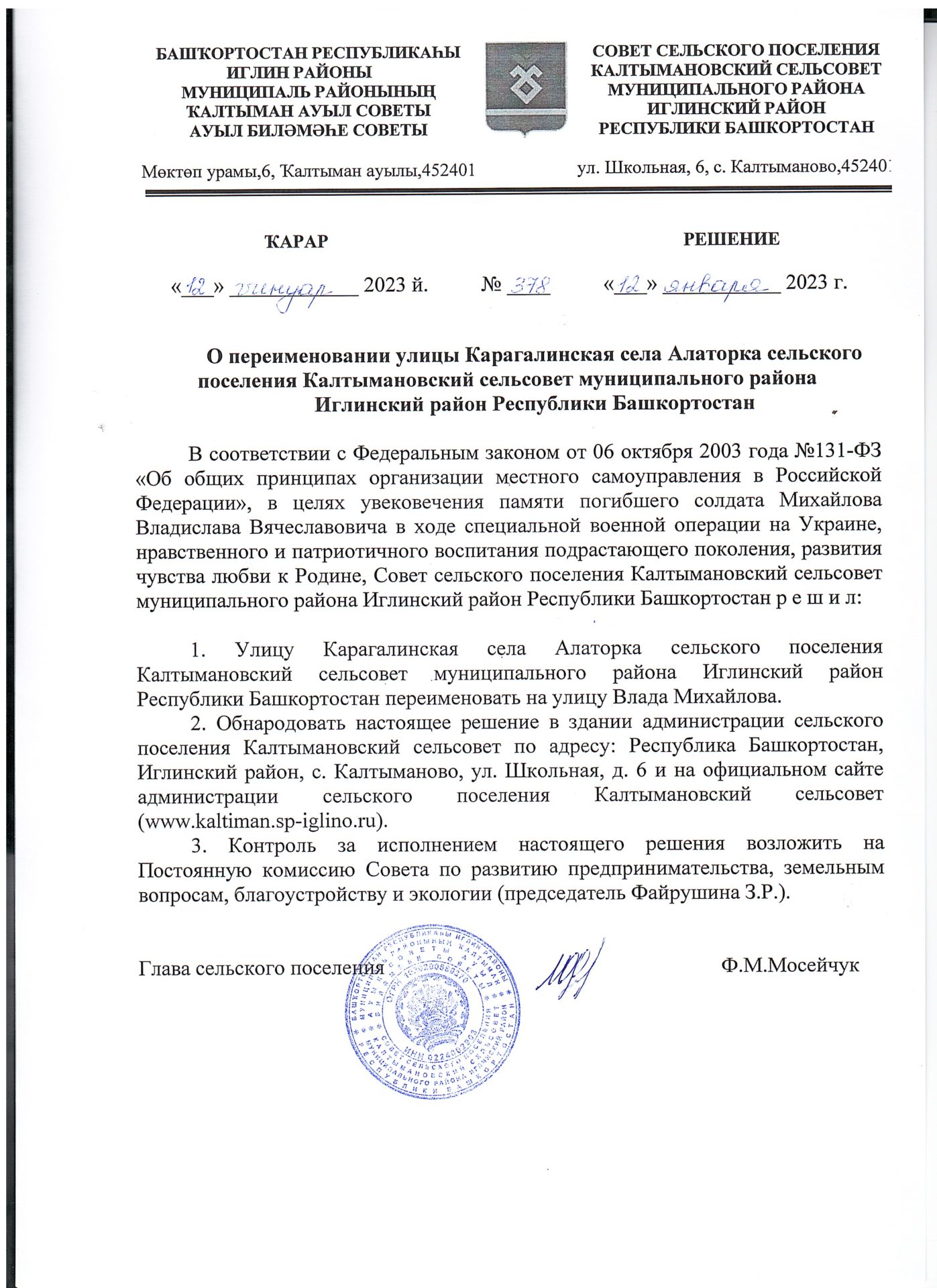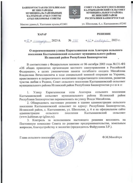 Решение №378 от 12.01.2023 г. О переименовании улицы Карагалинская села Алаторка сельского поселения Калтымановский сельсовет муниципального района Иглинский район Республики Башкортостан 12.01.2023 14