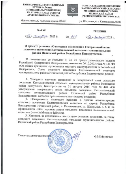 Решение № 381 от 12.01.2023 г. О проекте решения «О внесении изменений в Генеральный план сельского поселения Калтымановский сельсовет муниципального района Иглинский район Республики Башкортостан»