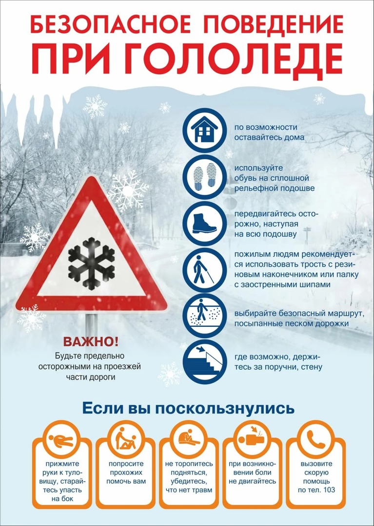 Будьте предельно внимательным на проезжей части дороги – не торопитесь и не бегите. Руки по возможности должны быть свободны, старайтесь не носить тяжелые сумки и не держите руки в карманах — это увеличивает вероятность падения.