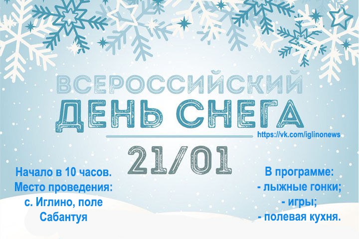 Всероссийский «День снега – 2018» 17.01.2018 42 Соревнования по лыжным гонкам состоятся 21 января 2018 года в с. Иглино на поле Сабантуя. Регистрация участников с 10.00 ч., старт в 11.00 ч.. Приглашаем принять активное участие всех желающих.